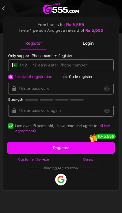 Currently, G-555 supports only Pakistani players and local payment methods.